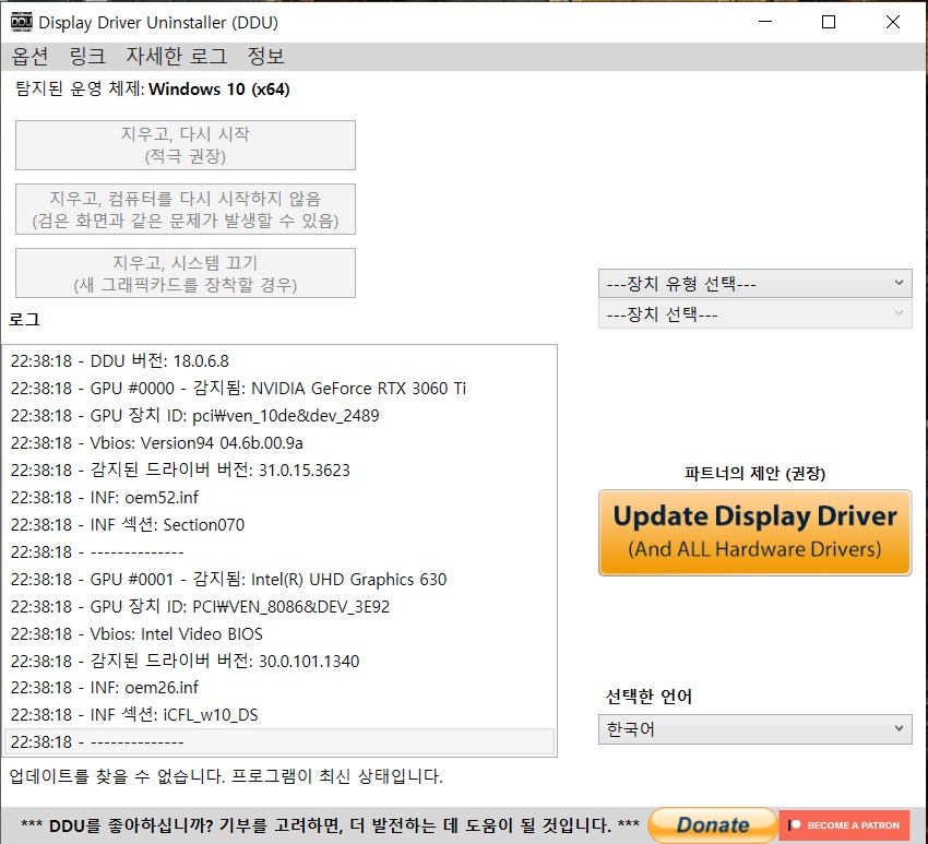 3. DDU 실행 및 그래픽 카드 드라이버 제거: