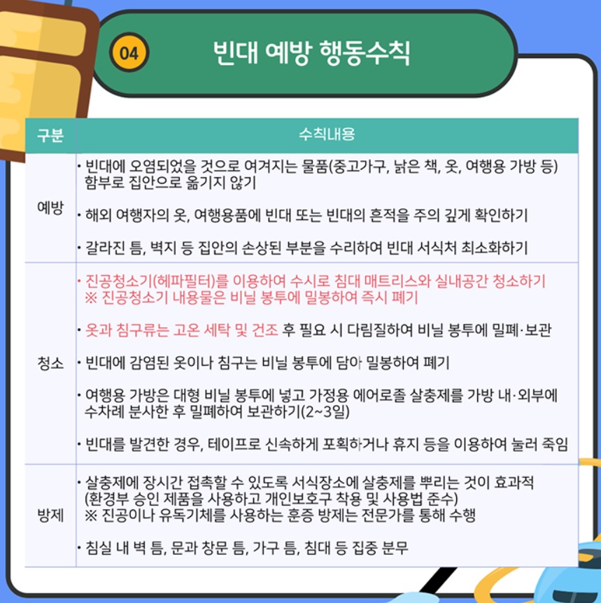 - 빠른 대응: 빈대에 물렸을 경우, 가능한 빨리 물린 부위를 물에서 깨끗이 씻어주세요. 이물질이 남아있을 경우 감염의 위험이 있습니다.